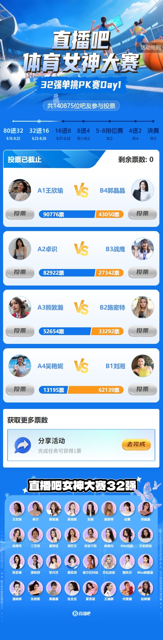 2025年『体育女神大赛』昨日进入32强单挑PK赛阶段,淘汰赛Day1(A组、B组)结果如下: