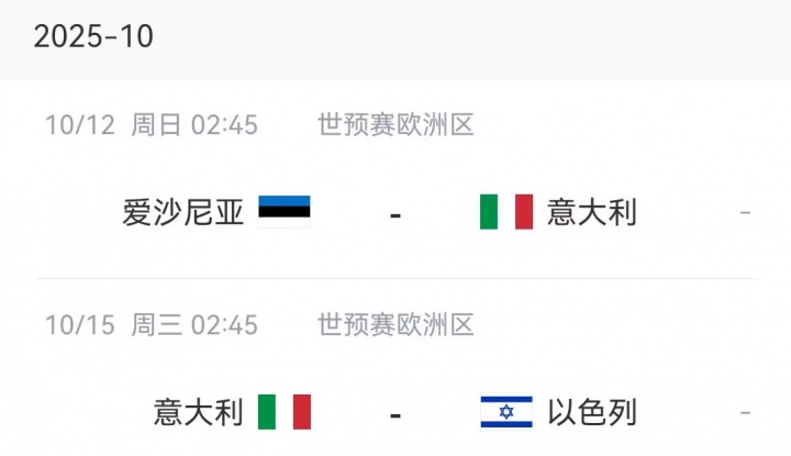 意大利目前的世预赛出线形势并不乐观:他们少赛一场落后小组排名第1的挪威6分。10月12日,他们将客场挑战爱沙尼亚;10月15日,他们将主场迎战以色列。